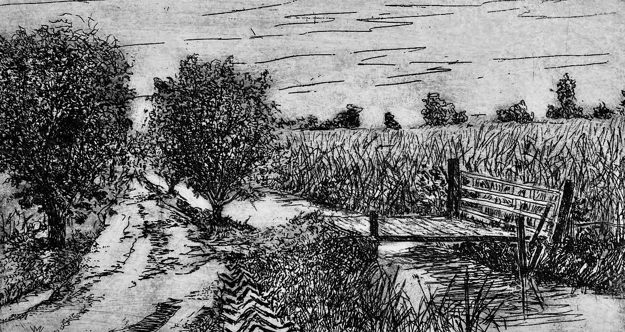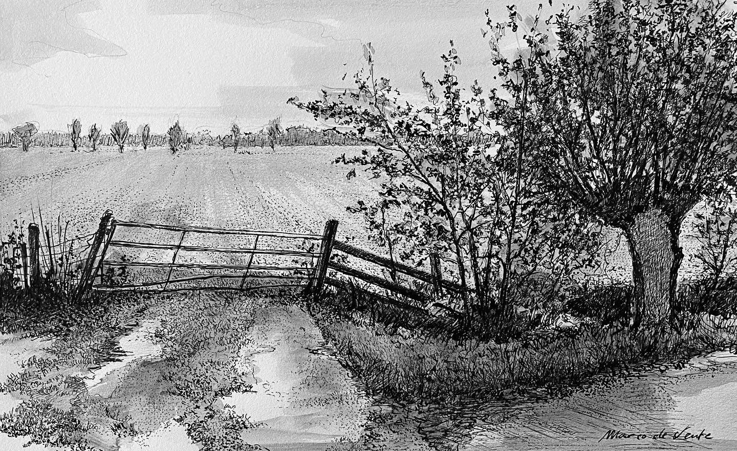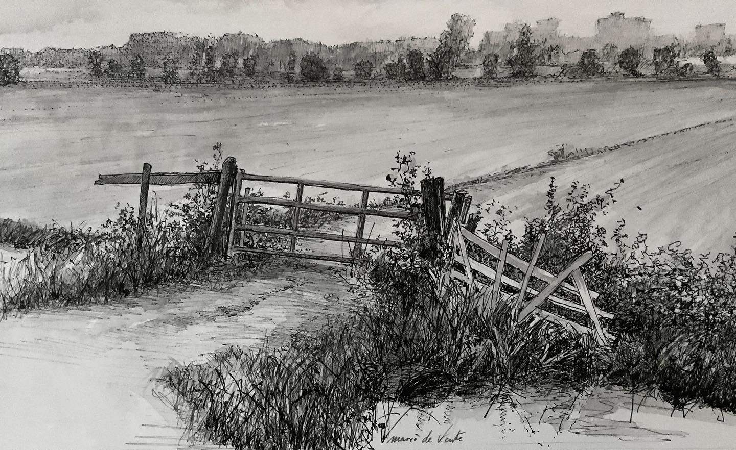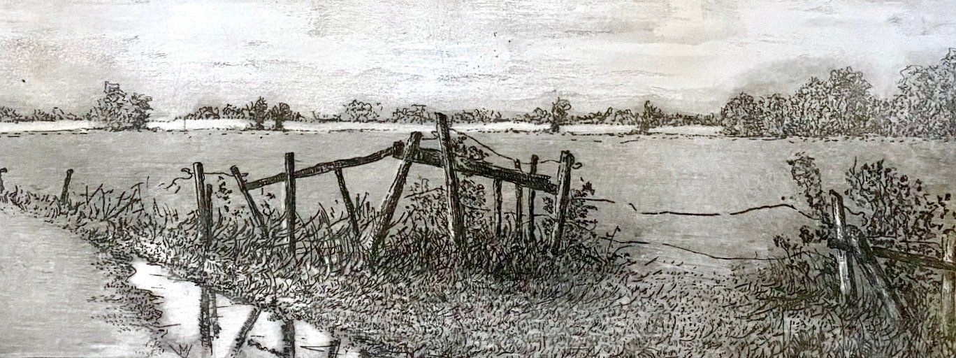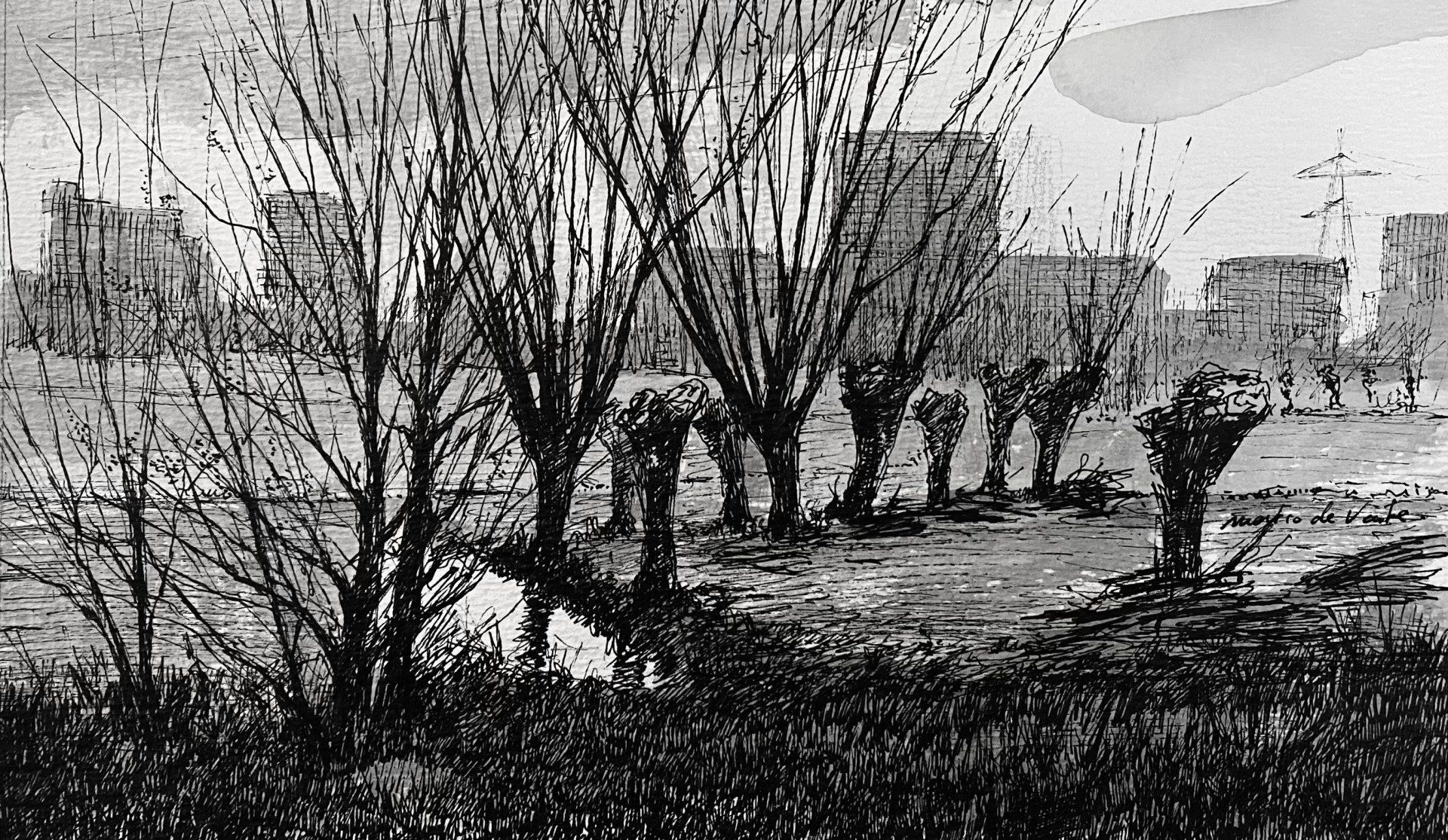 bestaat uit tekeningen en etsen die nu nog het beeld schetsen van een oude polder. Met hier en daar een doorzicht naar de oprukkende stad.