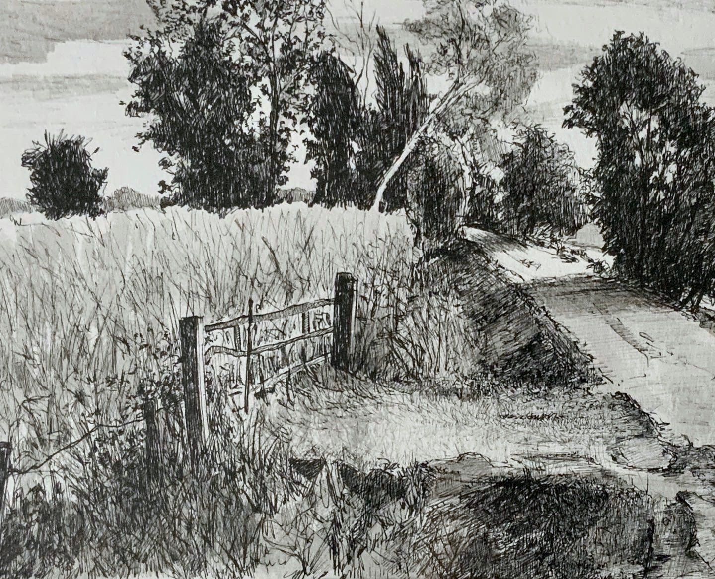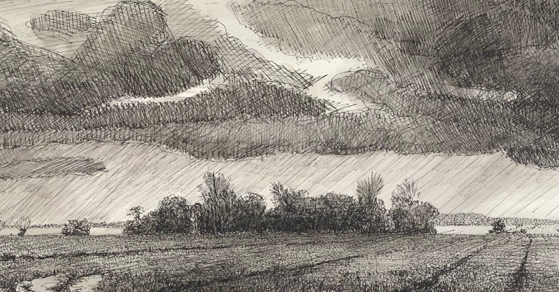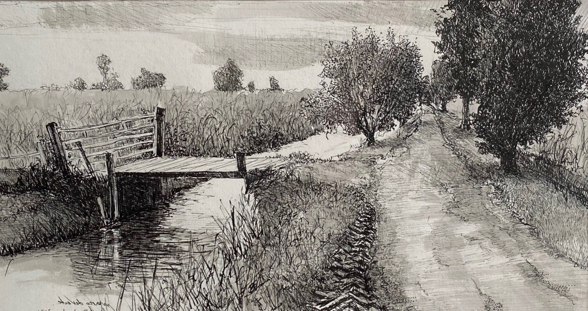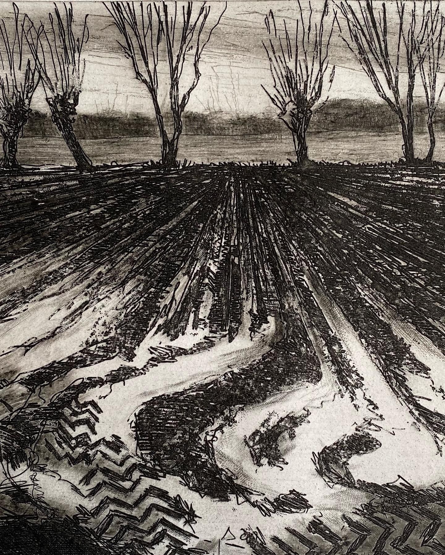 bestaat uit tekeningen en etsen die nu nog het beeld schetsen van een oude polder. Met hier en daar een doorzicht naar de oprukkende stad.