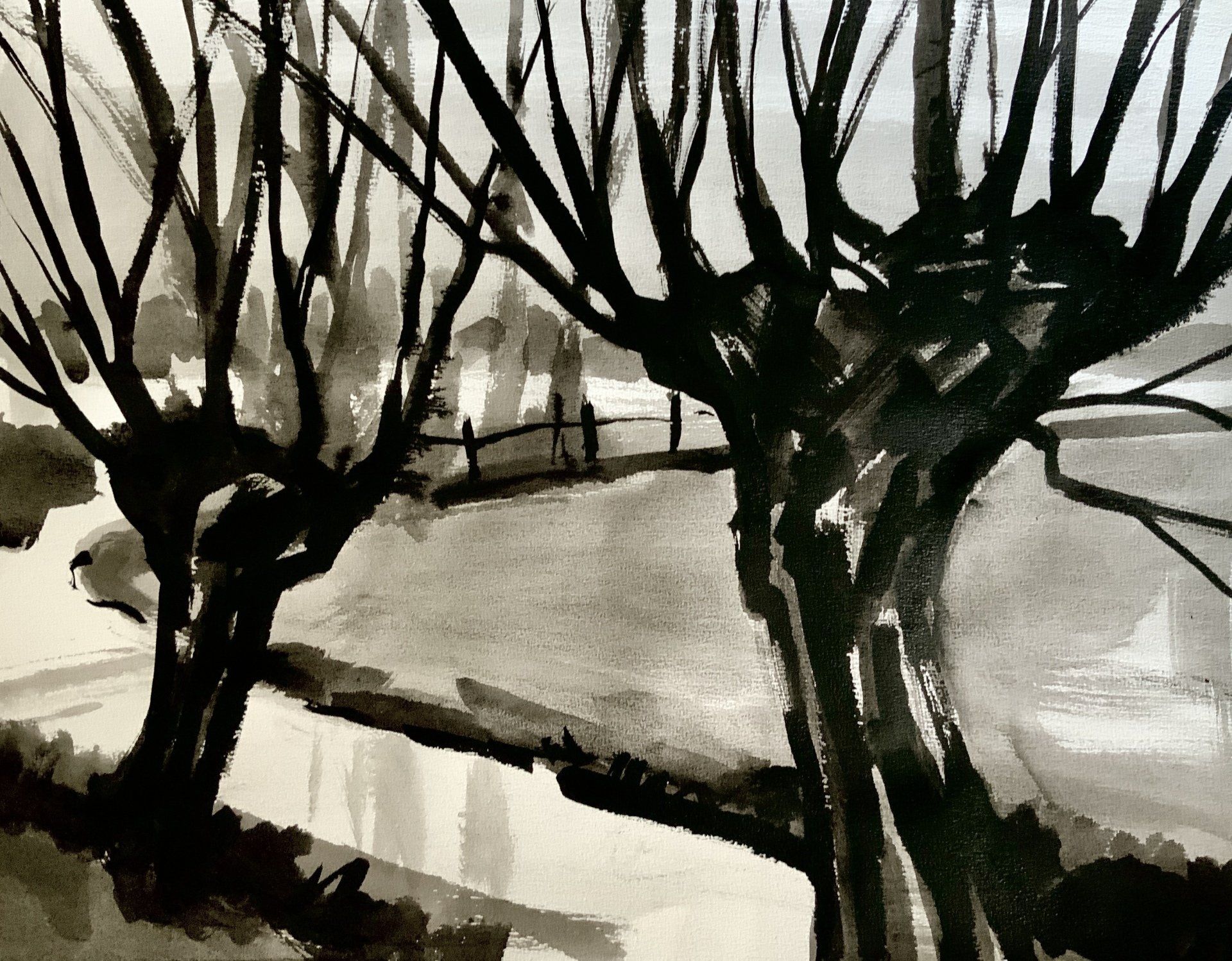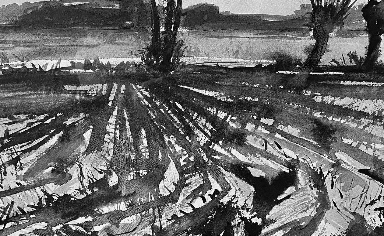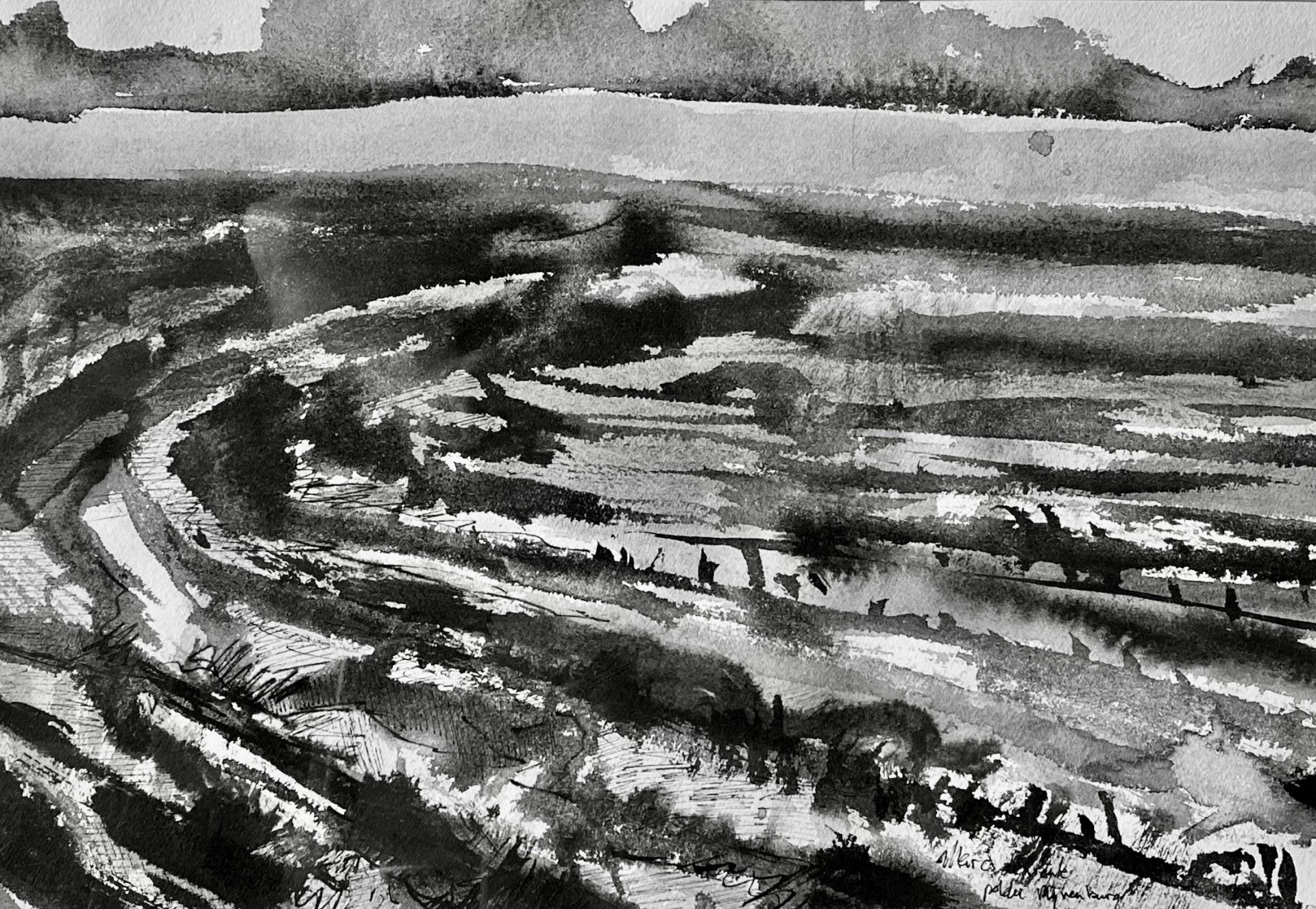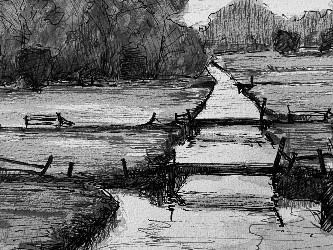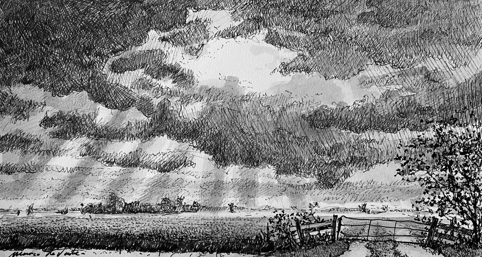 bestaat uit tekeningen en etsen die nu nog het beeld schetsen van een oude polder. Met hier en daar een doorzicht naar de oprukkende stad.